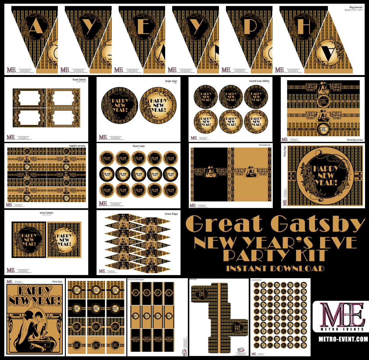 Gatsby New Year Party Kit Digital Files, Custom party decorations, printable files, Metro-Events will email the files & you can print as many as you need.