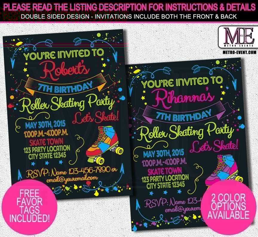 Skating Birthday Party Invitations - Your choice of digital invitation file(s) or Printed invitations.