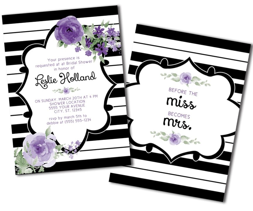 Purple Flower, Bridal Invitations, Bachelorette Party Invitations - Your choice of digital invitation file(s) or Printed invitations.