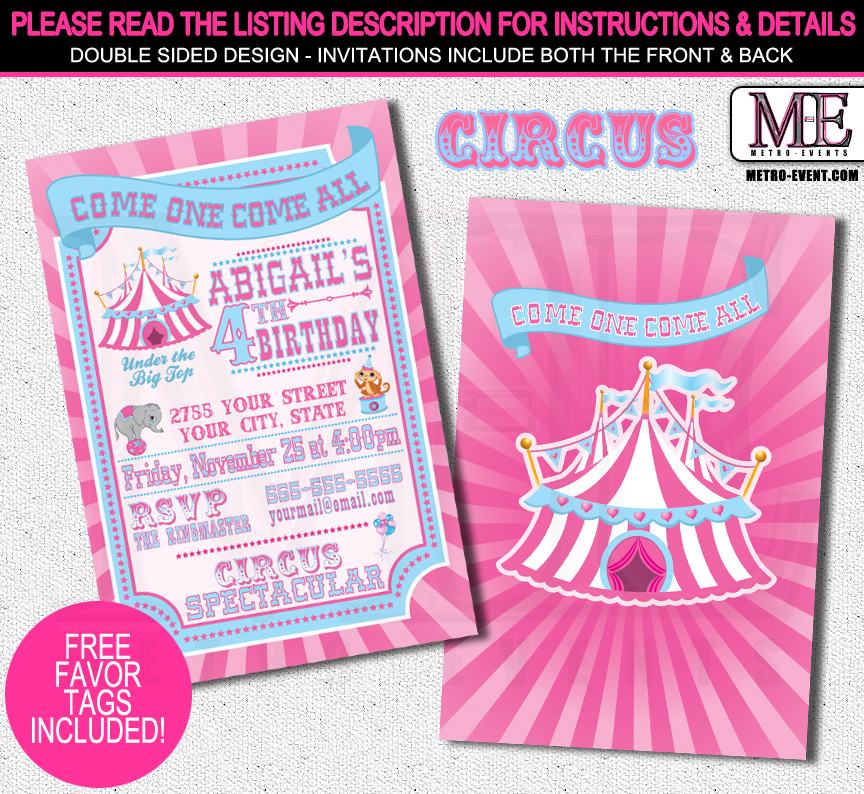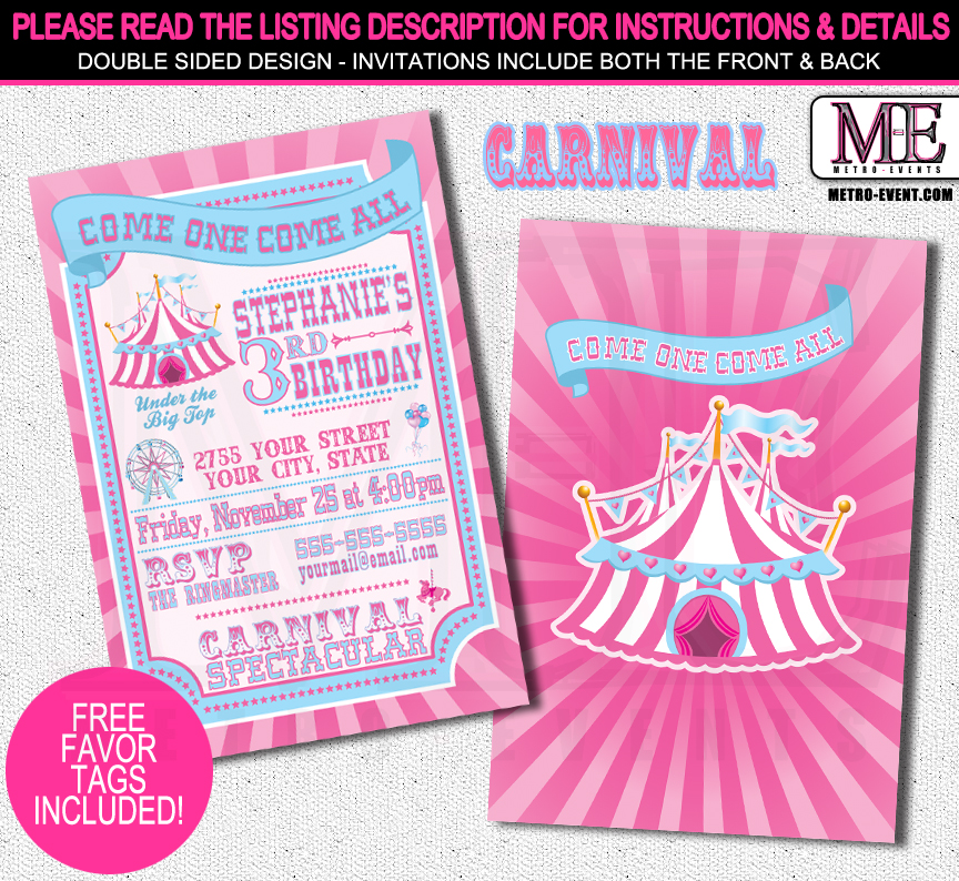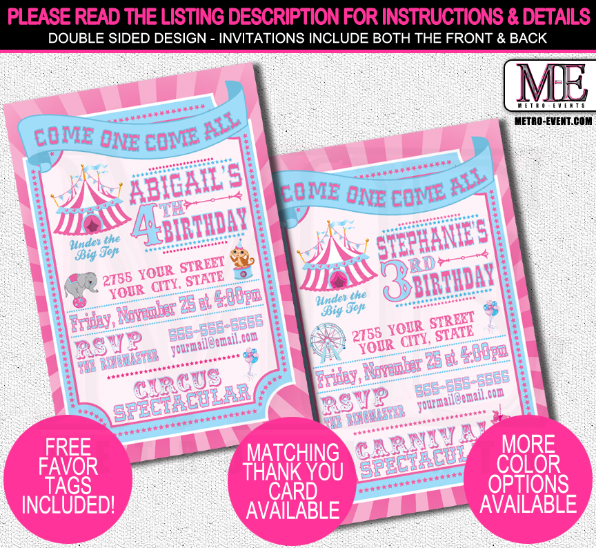 Circus or Carnival Party, Digital File: Custom Invitations, this is a printable file, I email the files to you, and you can print as many as you need. The colors are: Pink & Blue