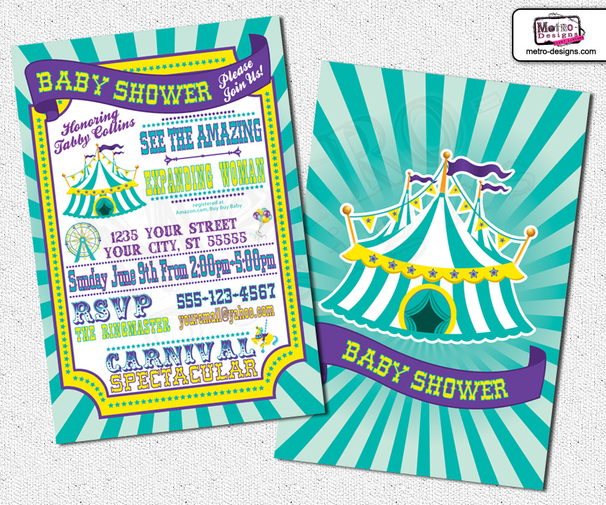 Circus or Carnival Party, Digital File: Custom Invitations, this is a printable file, I email the files to you, and you can print as many as you need. The colors are: Teal Purple & Yellow