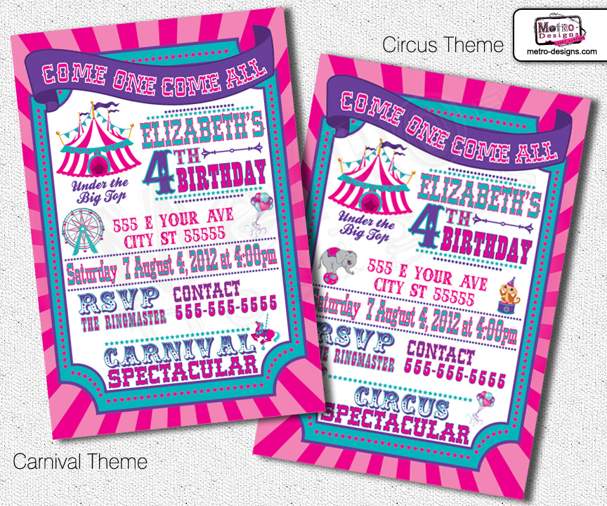 Circus or Carnival Party, Digital File: Custom Invitations, this is a printable file, I email the files to you, and you can print as many as you need. The colors are: Purple, Teal & Hot Pink