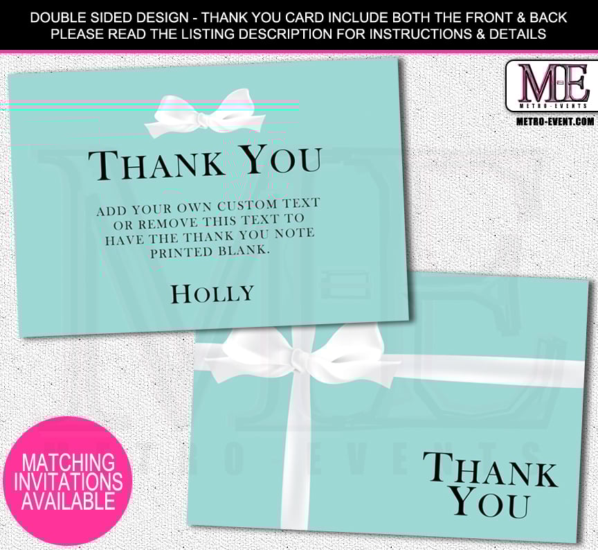 Cute and classy! Express your gratitude and show your appreciation with this simple and beautiful Green/Blue with a classy little white bow, this thank you card is a great way to tell your bridal shower guests or friends & family how much you appreciate them. You have the option of ordering these cards as a digital file or you can have them printed. Additional color options are available with this elegant card design. Please contact Metro-Events if you would like more information. We also have other thank you card design options available, if you don’t find what you are looking for please feel free to ask about our custom options.