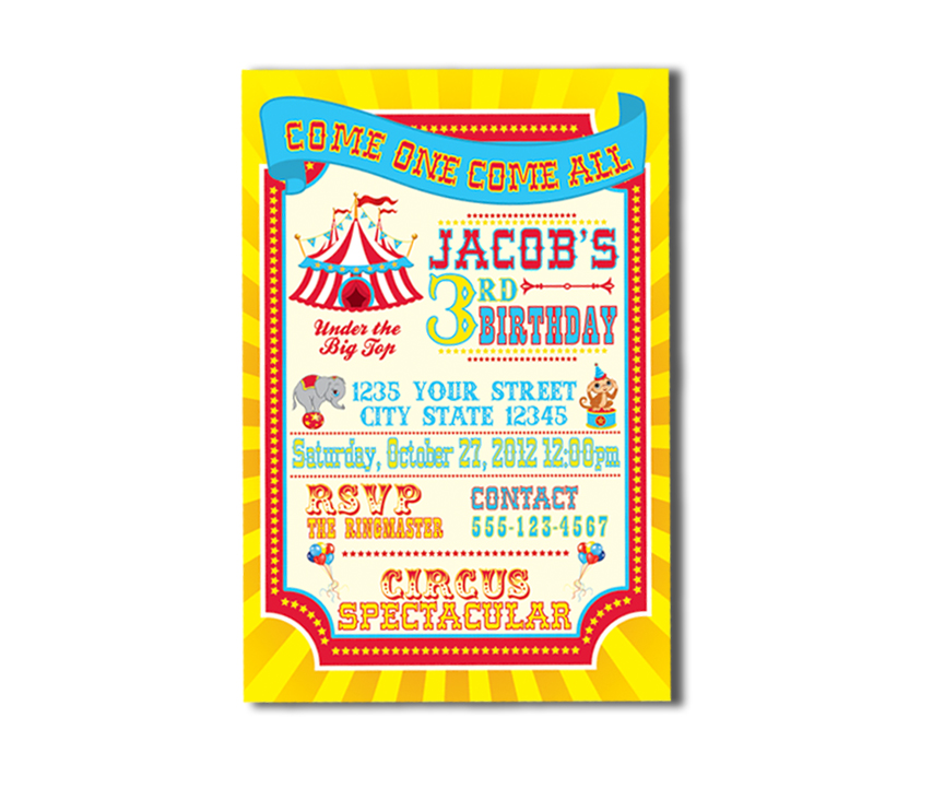 Come one, Come all, Come have some fun! It’s a birthday party for all ages! Circus and Carnival birthday parties are a blast! This party invitation has two theme options, circus and carnival. If you are planning a fun carnival party this year make sure you find the PERFECT carnival invitation around… You just found it! This is a traditional carnival invitation that can be used for boys and girls no matter what age they are going to be. This invitation is designed with classic design elements that are exactly what any carnival or circus party needs. Metro-Events has many color options available for this carnival party invitation, please contact us for more information.